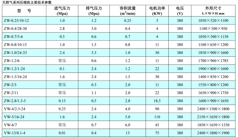 天然氣增壓壓縮機為往復活塞式。該系列壓縮機品種多,規格全,適用于天然氣回收、集氣、注氣、掃線、增壓、輸送等不同工業需要。該系列壓縮機潤滑方式有有油和無油潤滑,冷卻方式有水冷和風冷等多種形式。同時,該系列產品還具有占地面積少、重量輕、噪音低、運行平穩、安全可靠等特點。另外,可根據客戶的不同需求,設計制造不同排量和壓力的天然氣壓縮機。